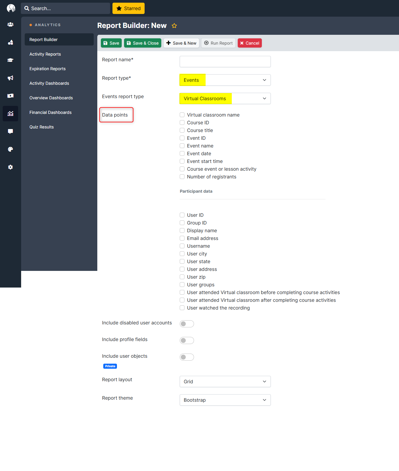 To access analytics for virtual classroom sessions, navigate to your Tovuti admin dashboard and go to Analytics > Report Builder > Report type = Events & Events report type = Virtual Classrooms. Use filters to select the relevant virtual classroom from listed Data points. You'll see data for session dates, attendance, and learner participation, helping you quickly assess overall classroom effectiveness at a glance.