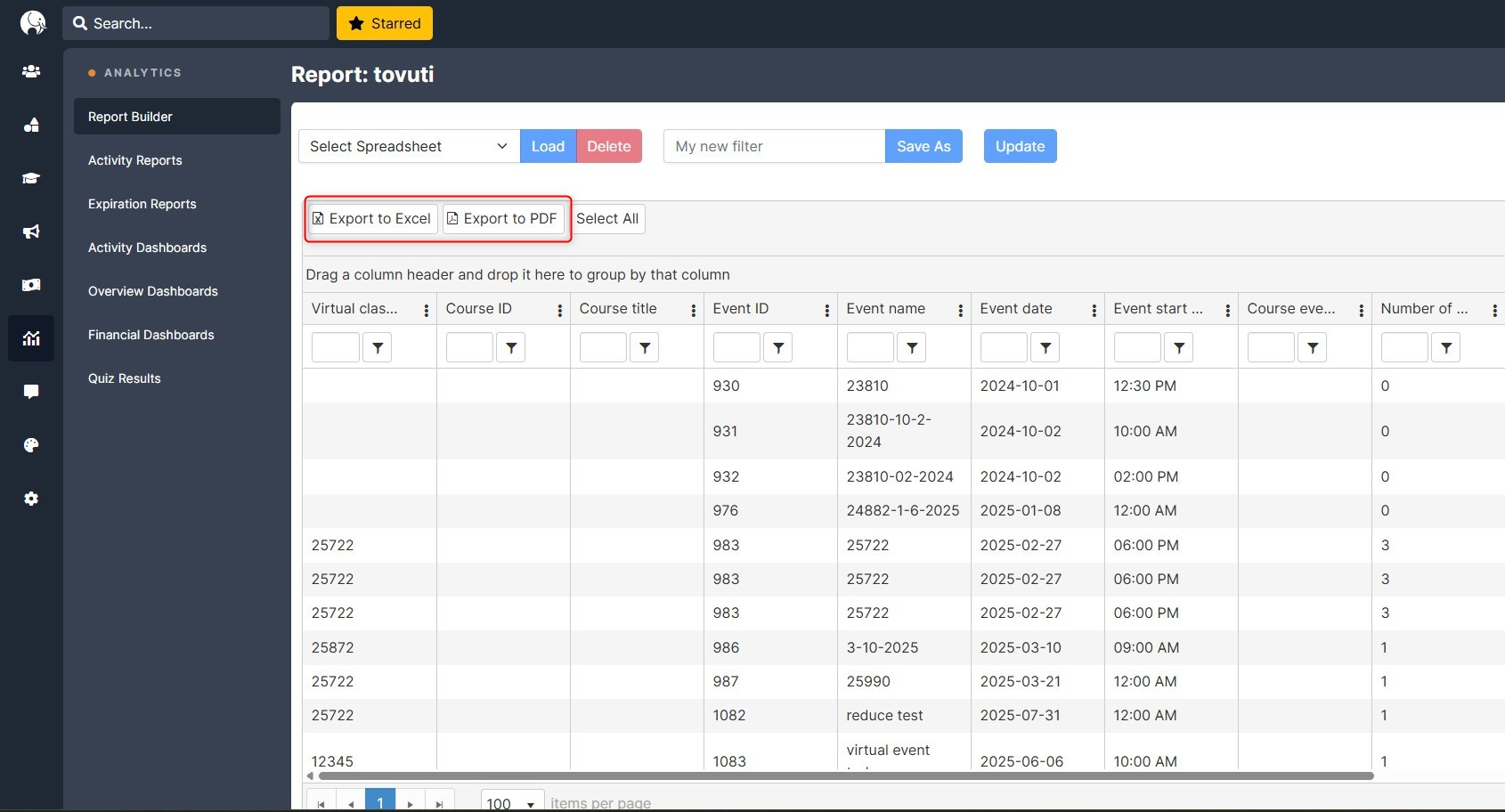 Tovuti allows you to export virtual classroom analytics and attendance data. Common formats include CSV and PDF. You can: Download reports for HR or compliance, share insights with training managers, provide summarized attendance and participation overviews to stakeholders to support strategic decisions and demonstrate training effectiveness.
