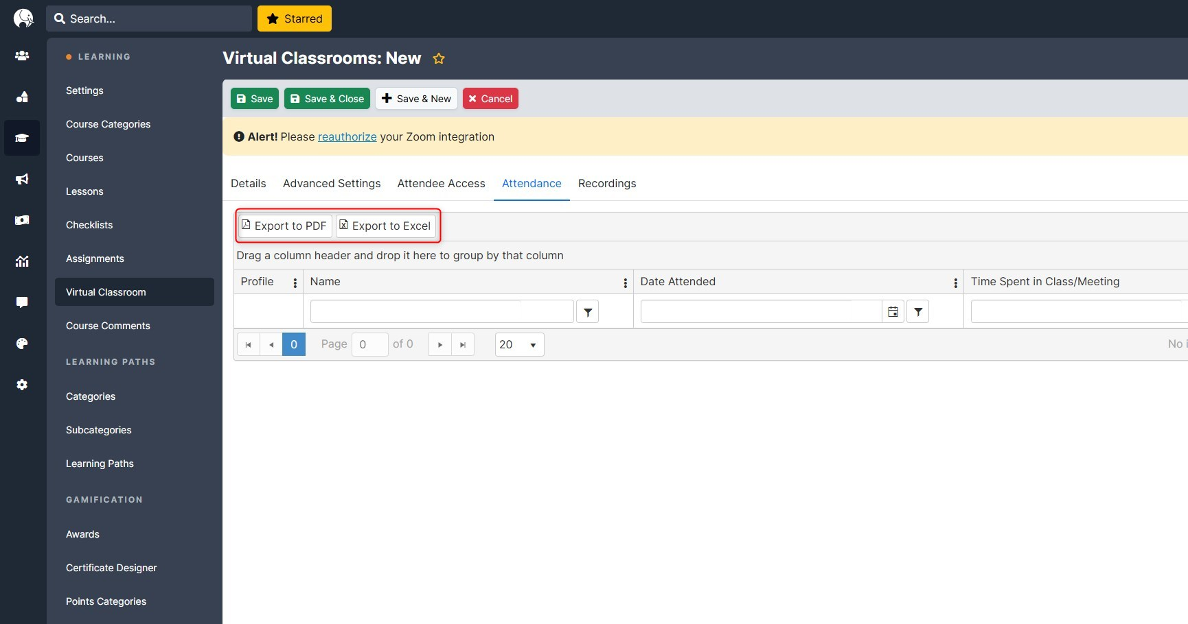 Attendance reports show who attended, how long each learner participated. Within these analytics, you can export attendance logs for compliance or auditing, monitor individual and group attendance trends for better learner support and insights. To get the attendance for your virtual classroom, go to Learning > Virtual Classroom > Attendance tab of the selected Virtual Classroom.