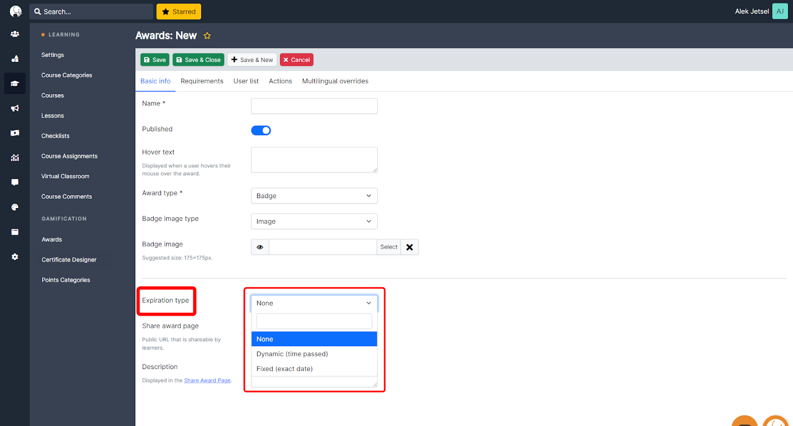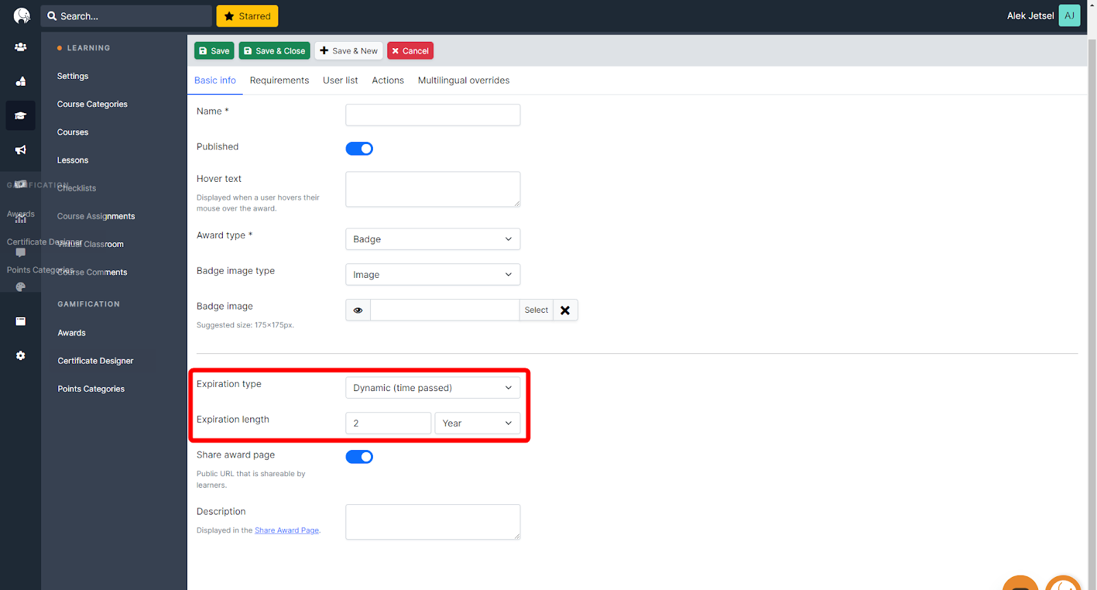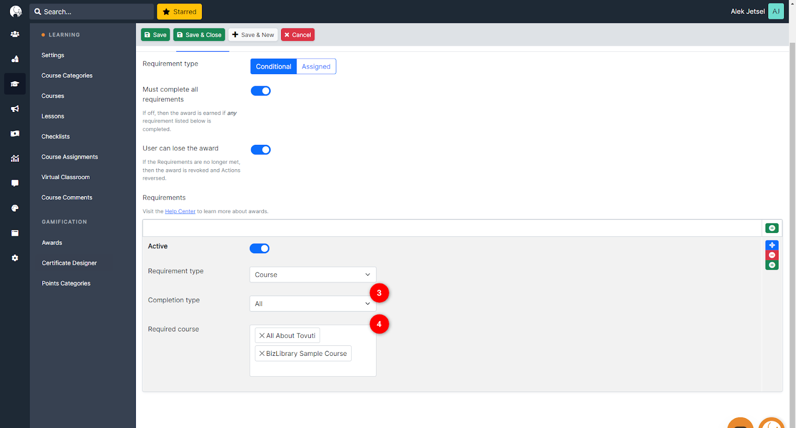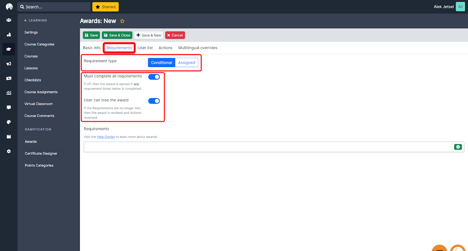 In the Requirements Must All Be Achieved field, select “Yes” if Learners must complete all requirements or “No” if a single requirement triggers the Award. Also, select if the user can lose this Award if requirements are no longer met.