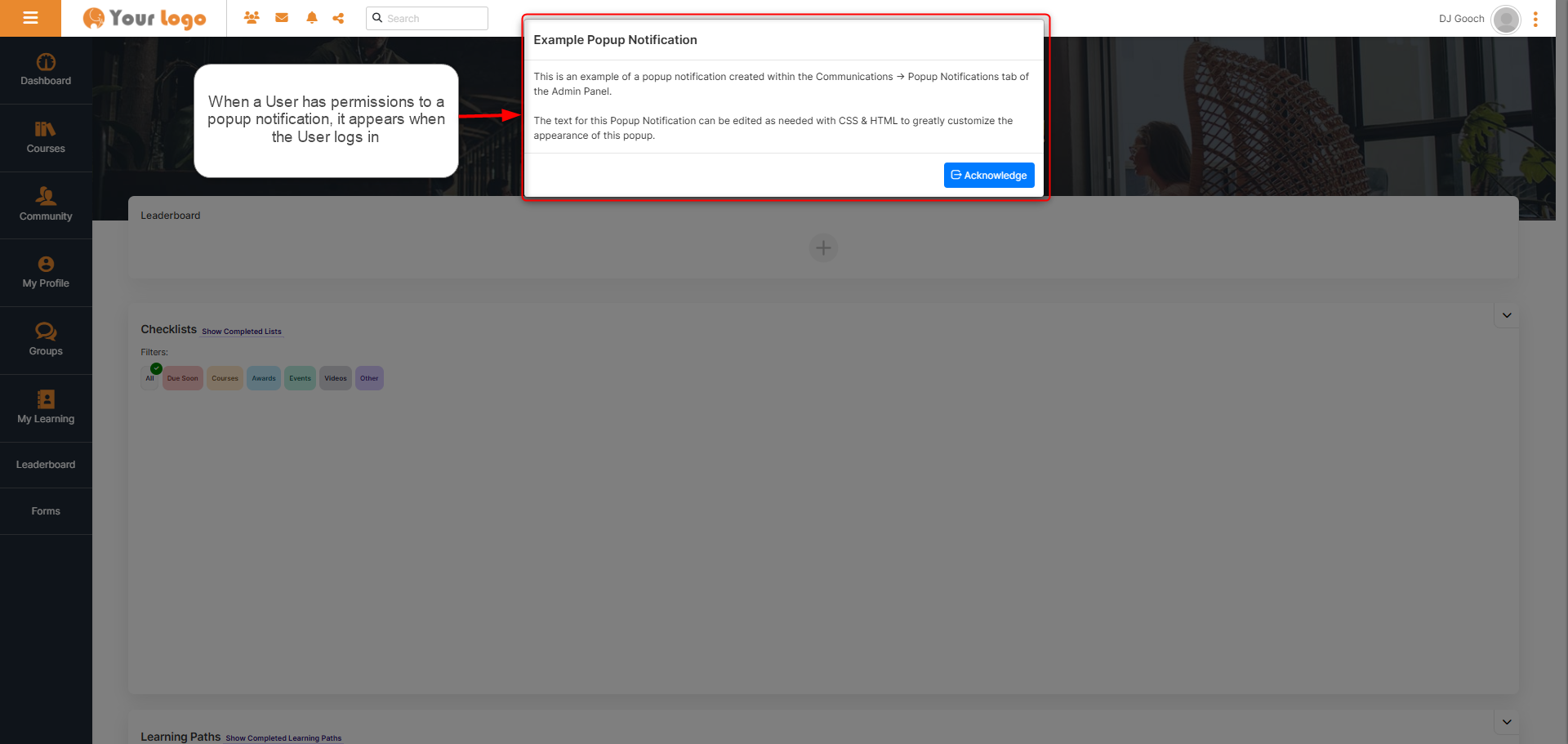 Tovuti allows Administrators to create Notifications that appear directly in the User’s dashboard. The custom button on a popup notification can direct users to a new course, updated event, or any other area within (or outside) the LMS.