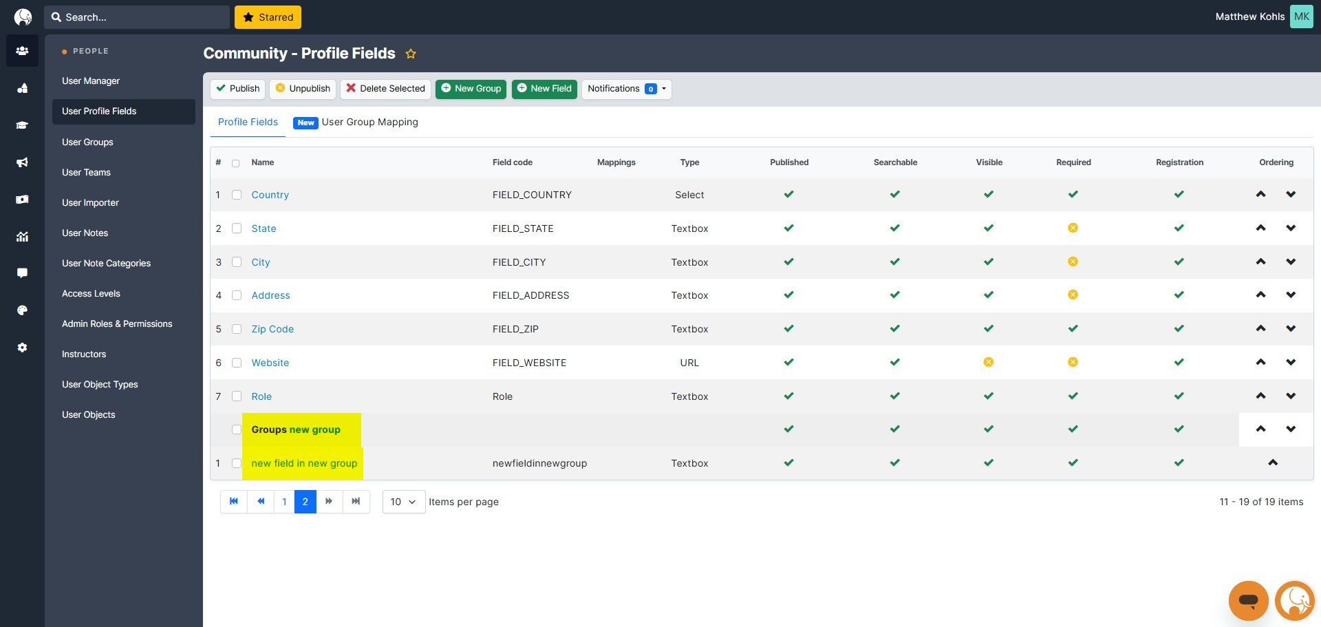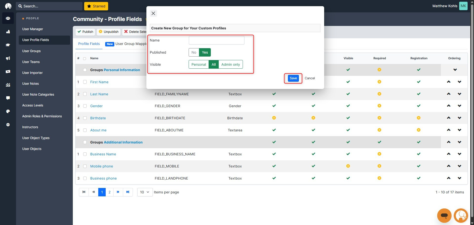 Of the listed Profile Fields, select which are Published, Searchable, Visible, Required, and the Fields included in Registration by checking or unchecking within the grid.