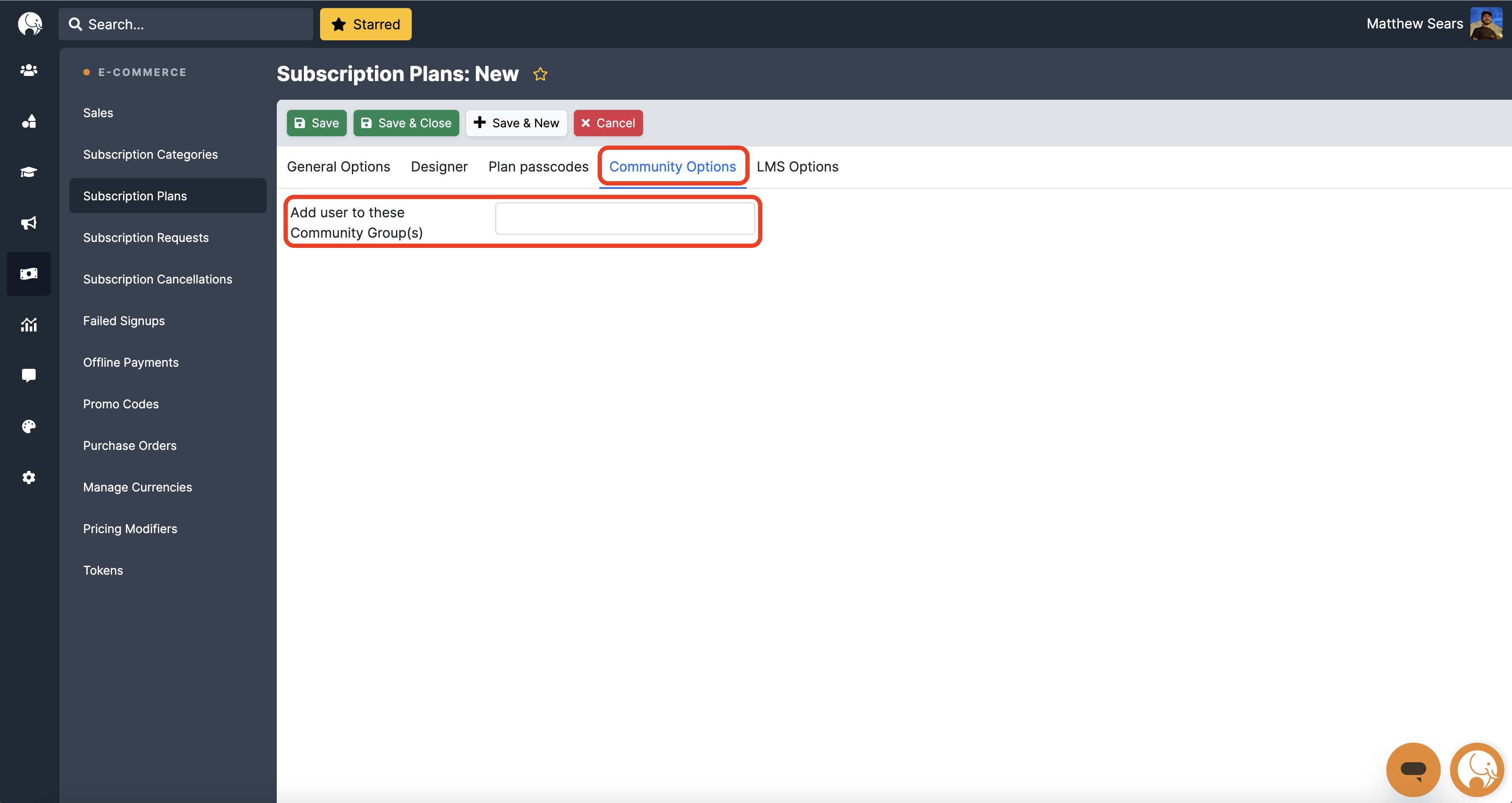 In the Community Options tab, set if enrollment in this subscription adds the user to any Community Groups.