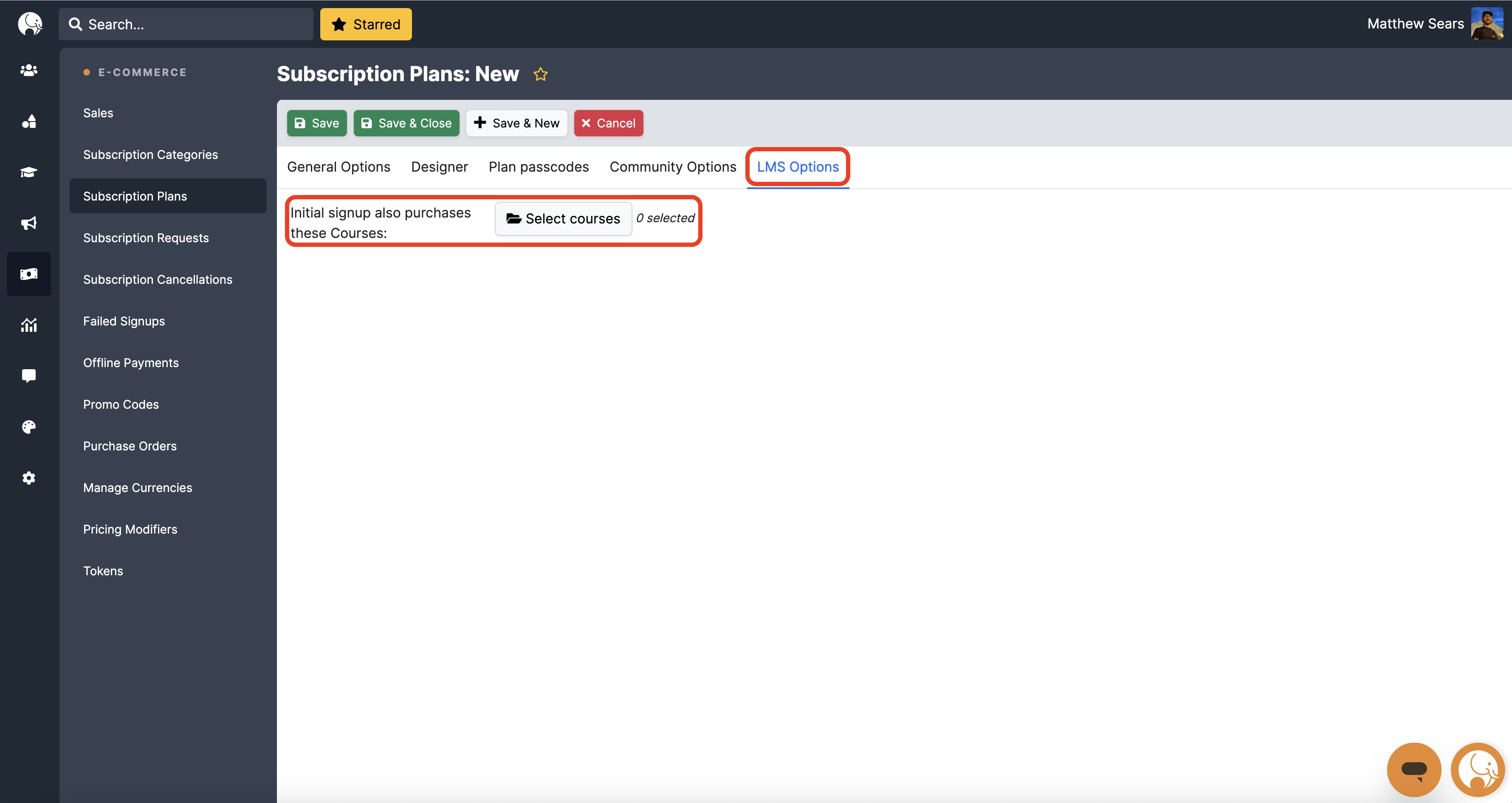 In the LMS Options tab, set if enrollment in the subscription also purchases any courses in the LMS.