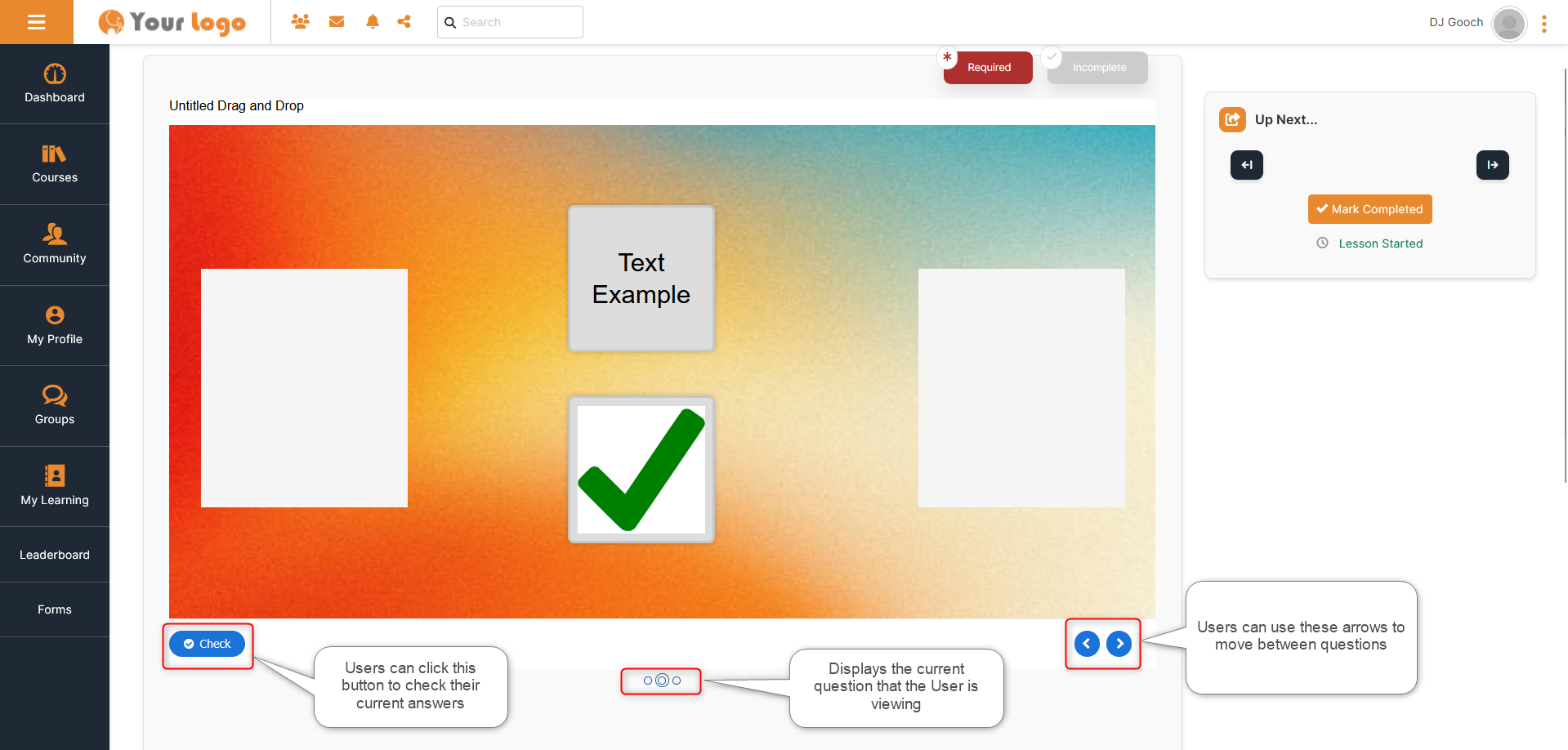 Within the bottom-left corner of the Quiz (Question Set) Interactive Content Users can submit their answers to be checked by the system.
