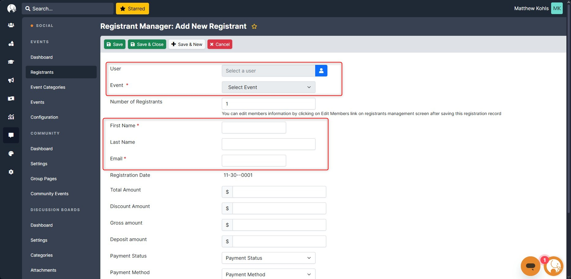 Select a User (needs to be done before selecting event). Select an Event and edit the Name and Email based on the autofill from the User's profile. The Registration Date autofills with the current date.