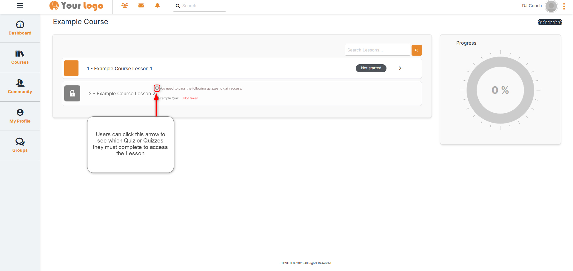 When Lesson Gating is applied to a course, users must complete Lessons in order.