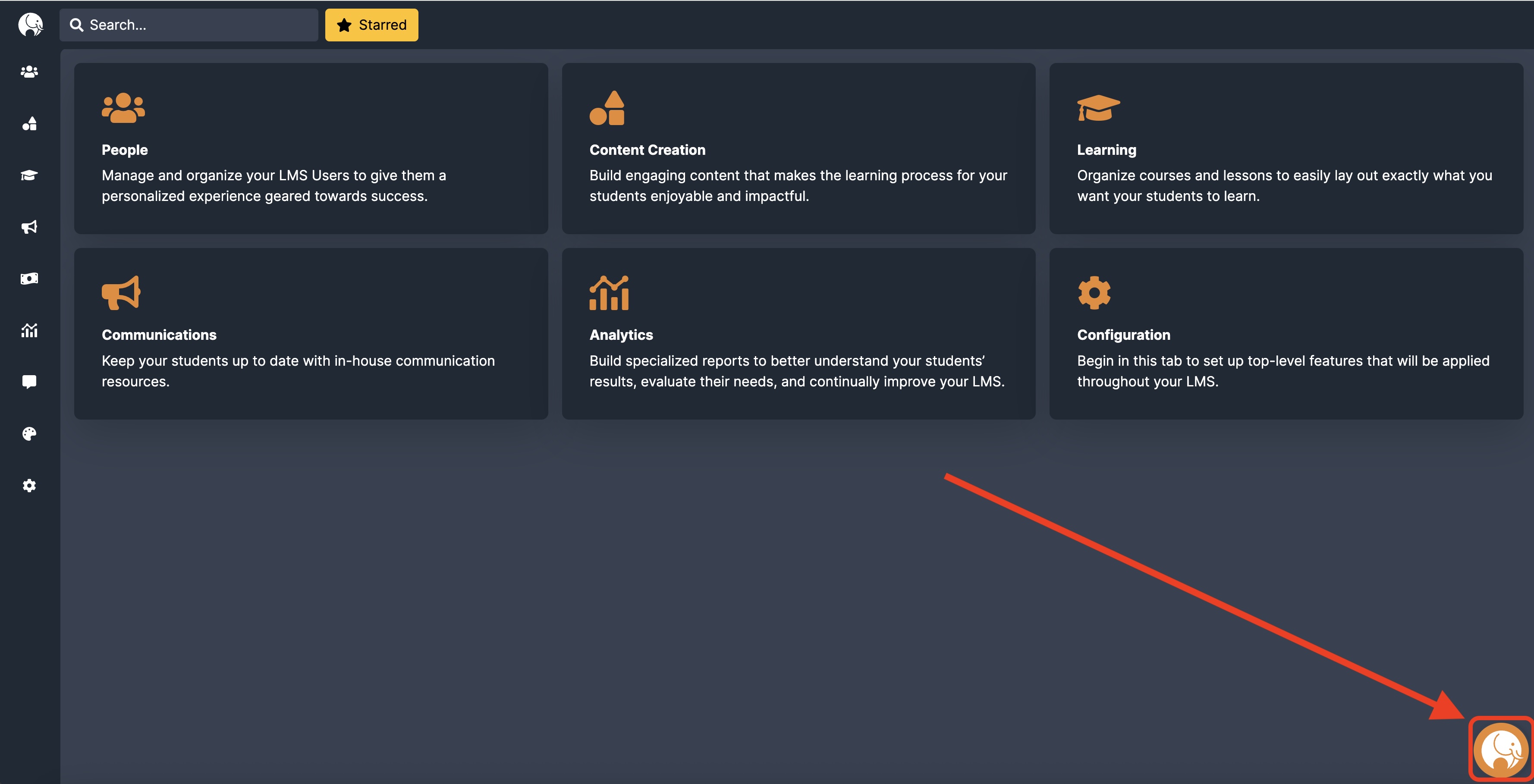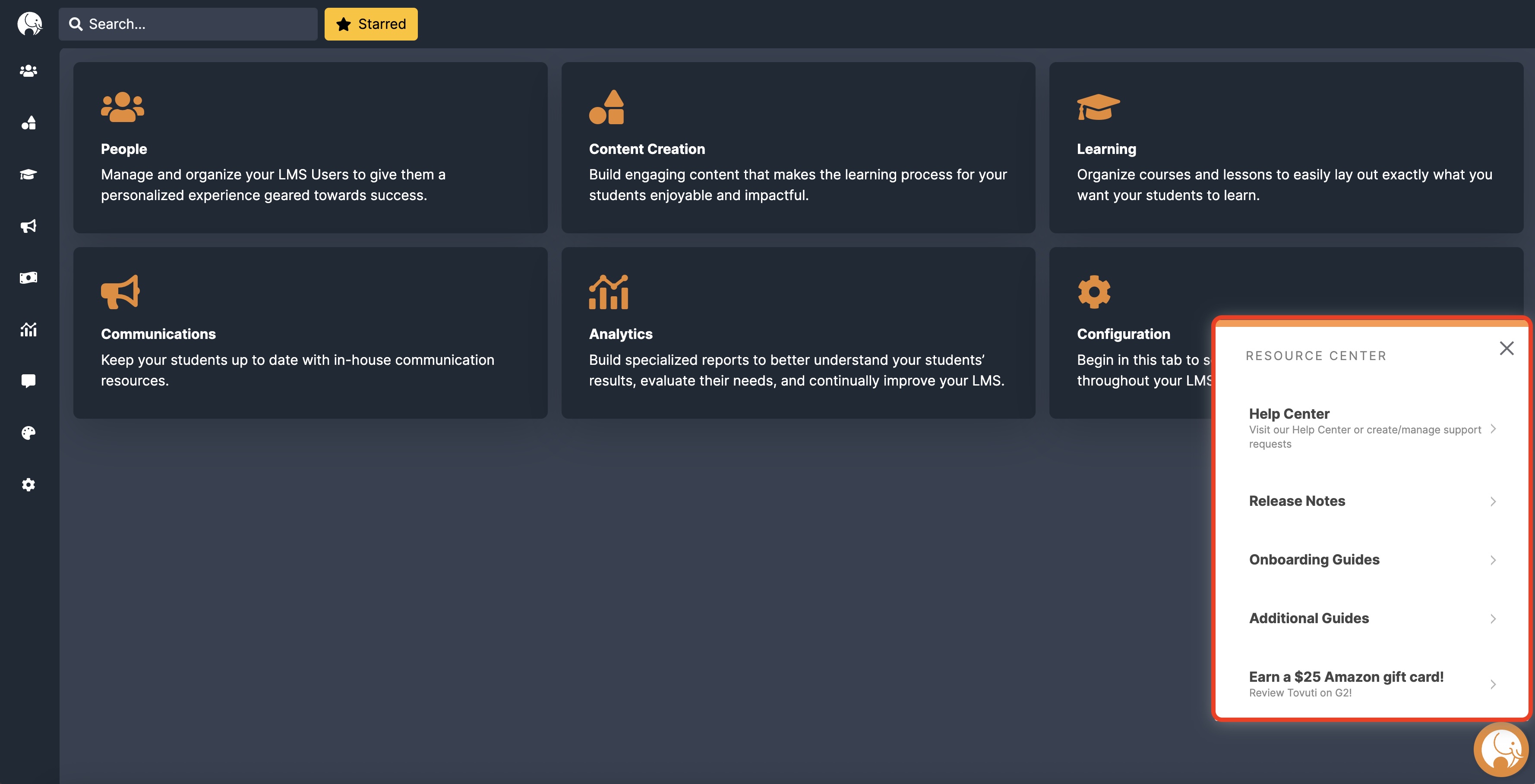 To access the Tovuti Resource Center, click the Tovuti logo in the bottom-right corner of the Admin Portal. The different options in the Tovuti Resource Center should then be displayed.