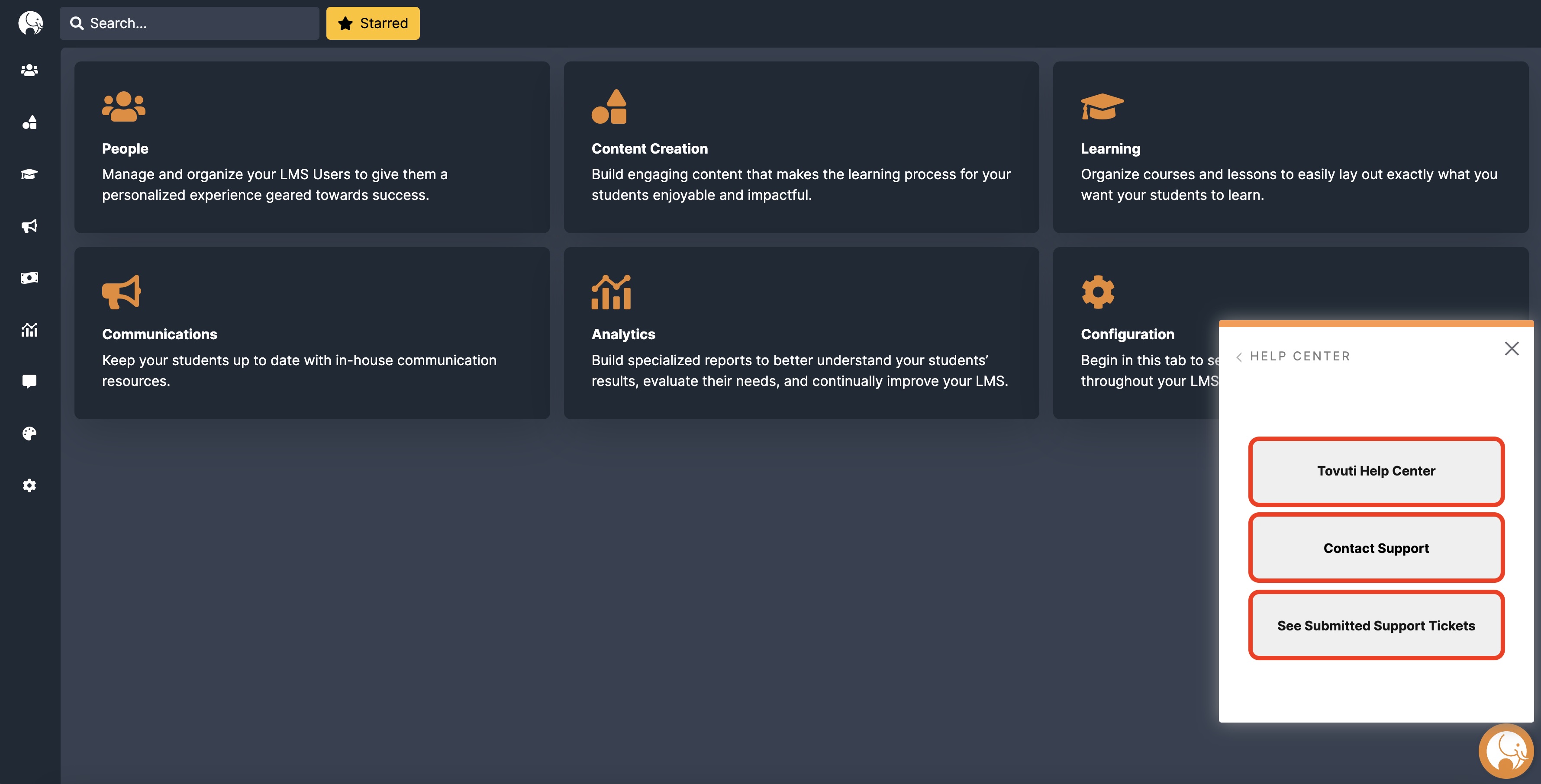 - Allows administrators to quickly access Tovuti's library of Help Articles.